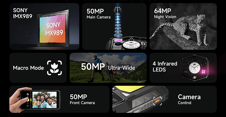 Das Kamerasystem des Ulefone Armor 29 Ultra wird von einer 50 MP Hauptkamera mit 1 Zoll Größe angeführt, die neue Standards für Mobile Photography setzt. Electronic Image Stabilization sorgt für verwacklungsfreie Aufnahmen auch unter schwierigen Bedingungen. 8K Videoaufnahmen liefern unglaublich klare und detaillierte Ergebnisse, während die 50 MP Ultra Wide Kamera sowohl Ultra-Weitwinkel als auch Makro-Aufnahmen ermöglicht. Die 64 MP Night Vision Camera mit NightElf 3.0 Technologie macht auch bei völliger Dunkelheit gestochen scharfe Bilder möglich. Ein dedizierter Kamera-Button ermöglicht Instant Capture für schnelle Schnappschüsse und die 50 MP Selfie-Kamera sorgt für spektakuläre Selbstporträts.
